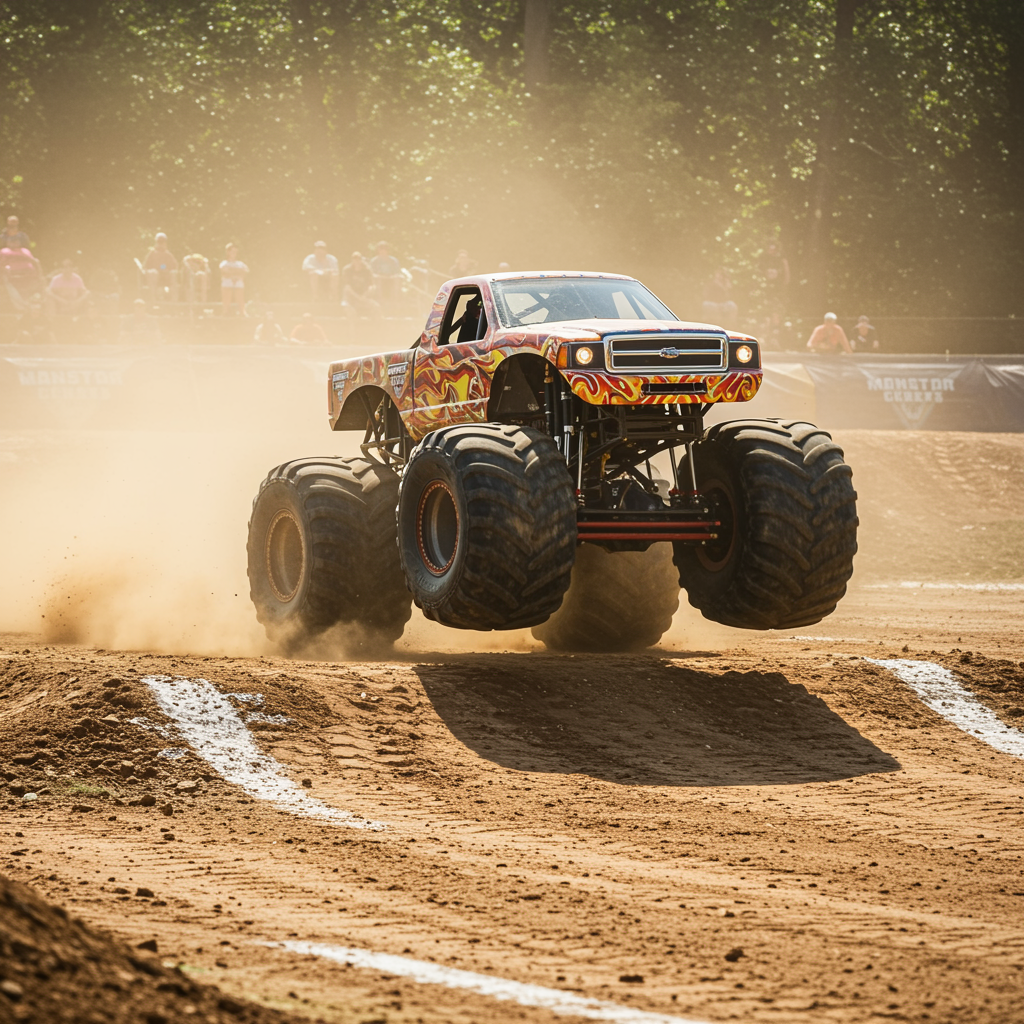 Capturing the thrilling spectacle of a monster truck as it barrels towards the camera, the photograph focuses on dynamic motion and the robust energy of the scene, highlighting the intricate details and textures with a rich dynamic range. The powerful vehicle leaps over dirt mounds, its massive tires kicking up clouds of dust, while the sunlight glistens off its vibrant colors, creating an exhilarating and immersive sports shooting experience.