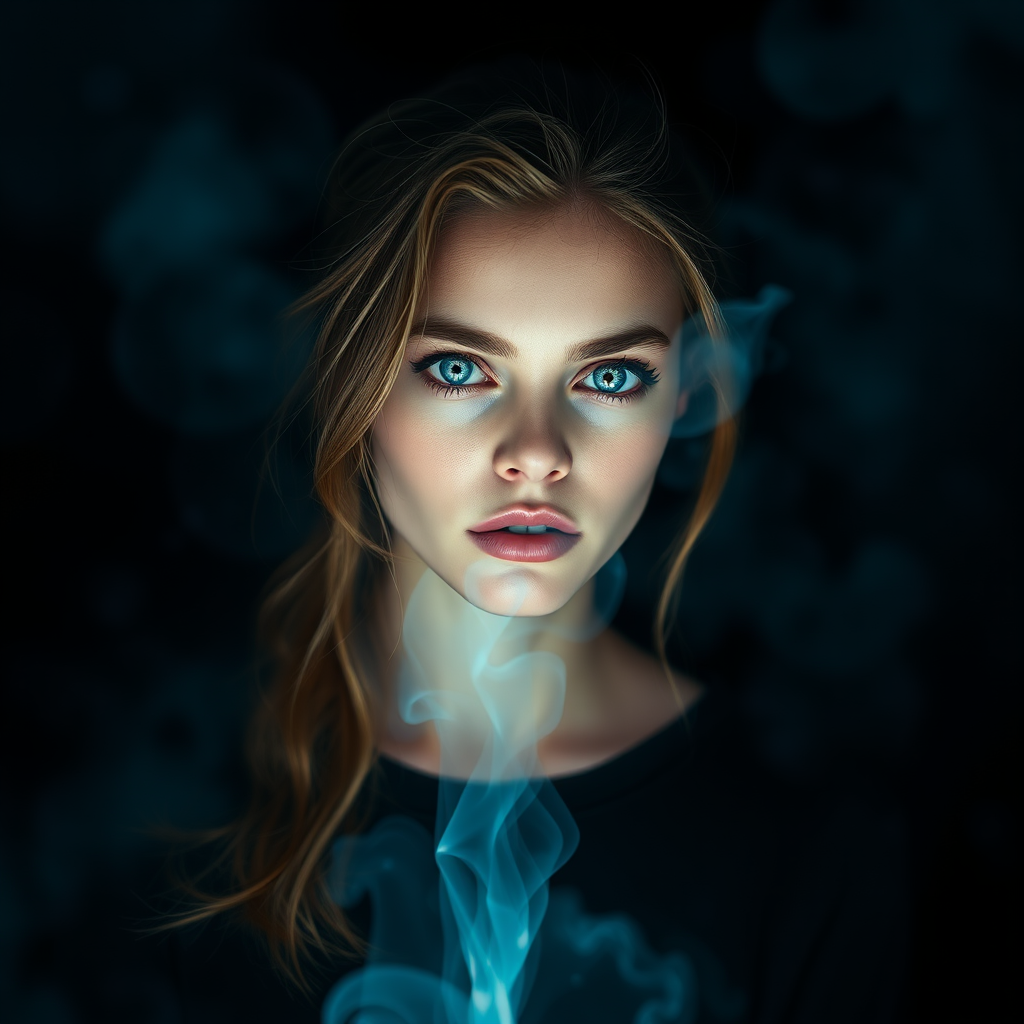 Cara Delevingne as a spectral figure, enveloped by luminescent mist, set against a midnight black background, capturing an energetic portrait with hyperrealistic precision, finely detailed in vibrant color, surrounded by a soft bokeh effect.