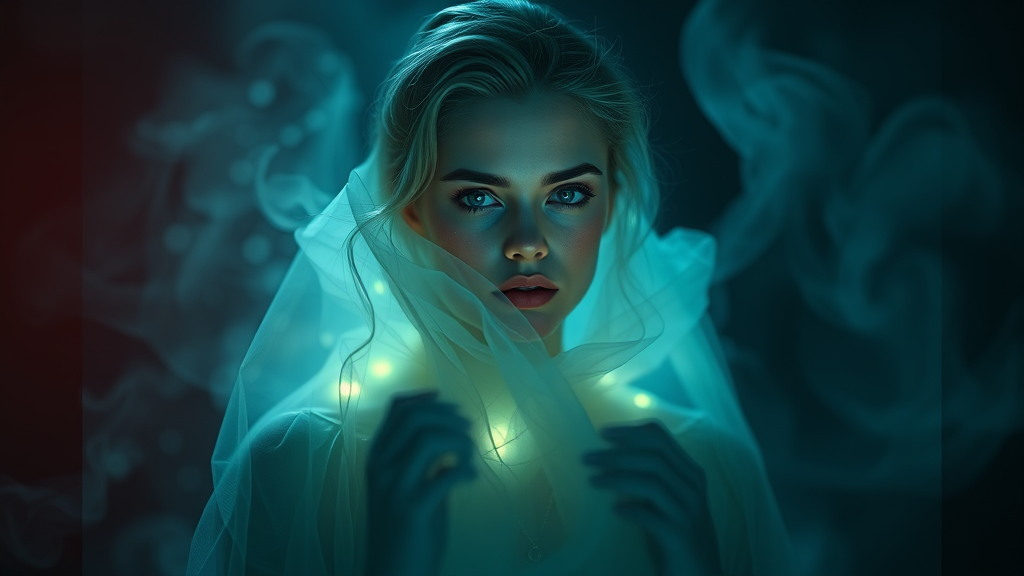 Cara Delevingne as a spectral figure enveloped by luminescent mist against a deep, shadowy backdrop, a vivid and dynamic portrait in hyperrealism with intricate, detailed colors, enhanced by a captivating bokeh effect.