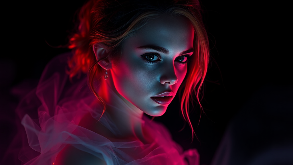 Cara Delevingne as a spectral figure, enveloped by ethereal luminescent mist, set against a deep black background, dynamic and expressive portrait in hyperrealistic detail, richly colored with intricate nuances, soft bokeh effect enhancing the haunting atmosphere.