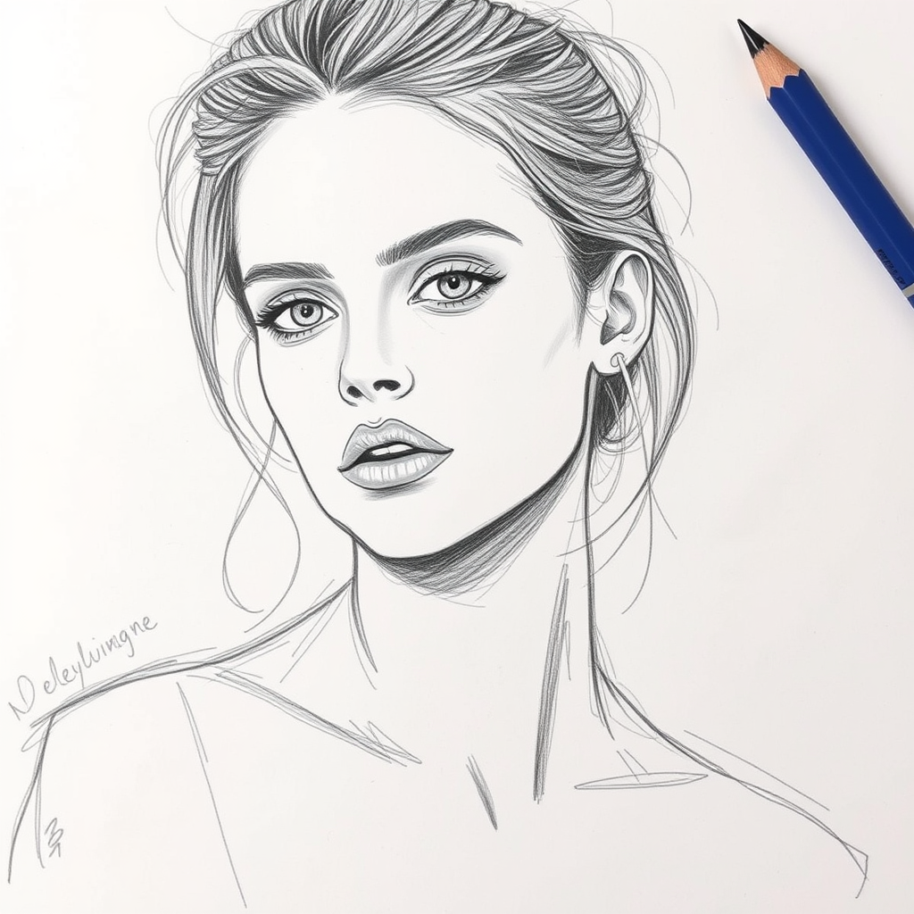 Cara Delevingne, loose pencil sketch, capturing her expressive features and confident aura on textured paper, subtle creative nuances highlight her unique charm and dynamic persona.
