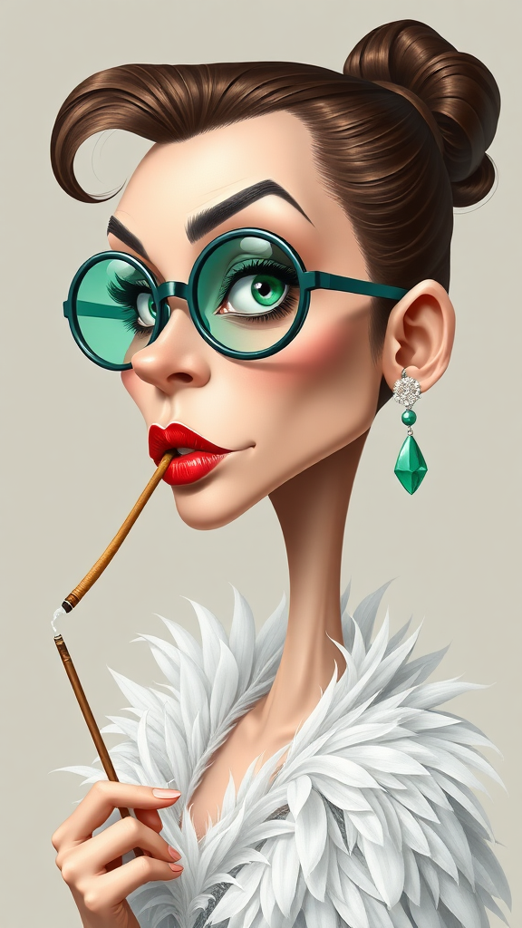 A humorous caricature of an eccentric fashionista, a 22-year-old woman of unspecified ethnicity with porcelain skin, vibrant green eyes, and an exaggerated pout. She has an elongated neck and an oversized head perched on a slim frame, featuring large, entrancing eyes and the tiniest nose, matched with voluminous lips. Her aloof expression adds to her quirky charm. She dons a flamboyant white feathery ensemble, complete with oversized circular emerald sunglasses perched on her nose, a single dangling earring, and brandishing a long cigarette holder with flair. The fashionista is captured in a striking side profile, highlighting her unique and exaggerated features.