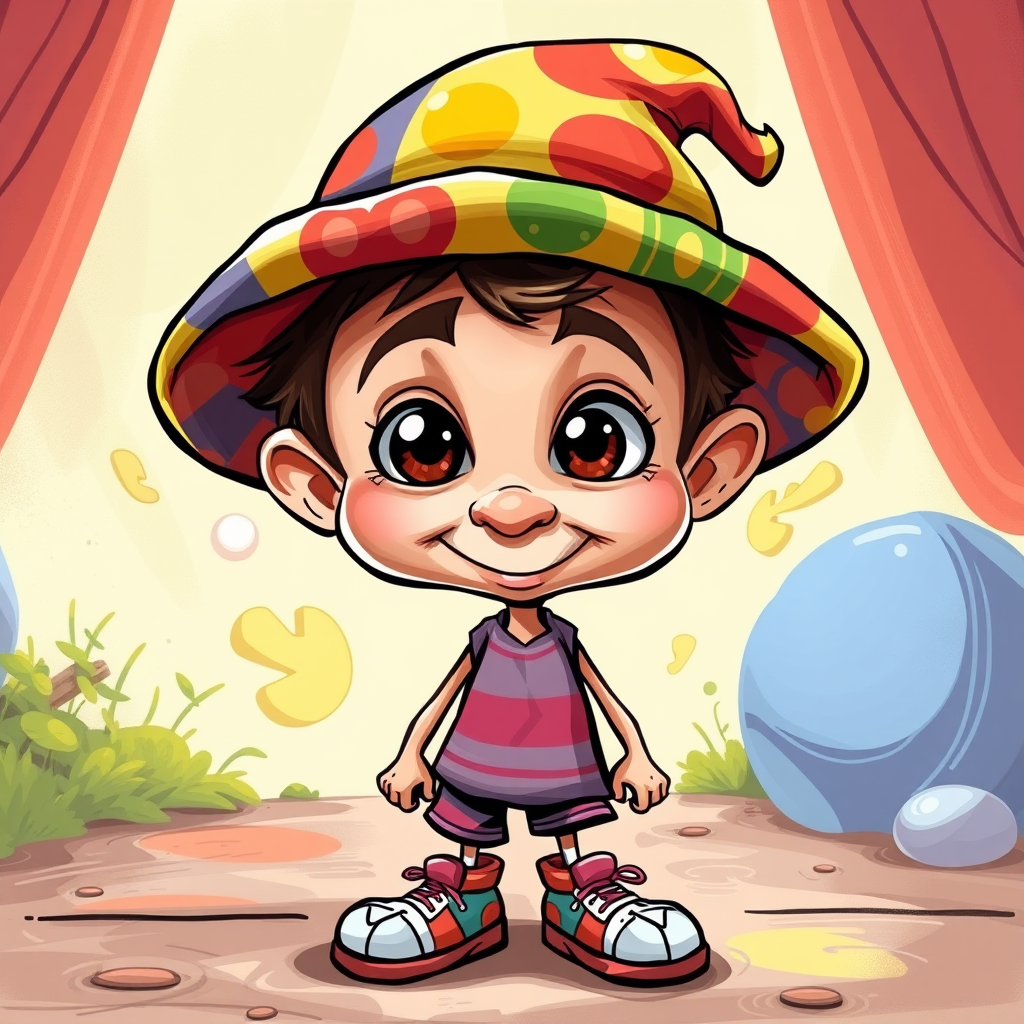 Caricature illustration of a whimsical children's comic book character, featuring comically exaggerated features with an elongated body and oversized eyes, wearing an oversized colorful hat and mismatched shoes in a vibrant, playful setting, style at 750 for a lively and dynamic atmosphere, aspect ratio 1:2.
