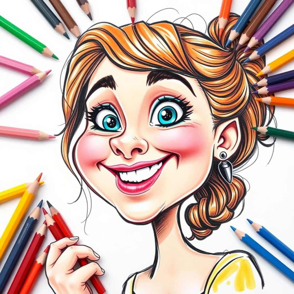 Caricature pencil drawing, adorable young woman in her mid-20s, vibrant color pencils, Pixar-inspired style, uproariously funny, highly exaggerated features, set against a clean white background, playful creativity, heightened chaos, aspect ratio 1:2, stylized with a whimsical touch.