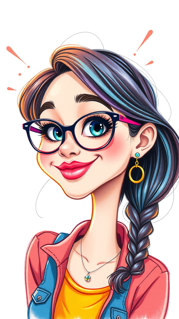 Caricature pencil drawing featuring a cute woman in her mid-20s, using vibrant color pencils, infused with Pixar's whimsical style, showcasing humorously exaggerated features, set against a clean white backdrop with a touch of playful chaos and creativity.