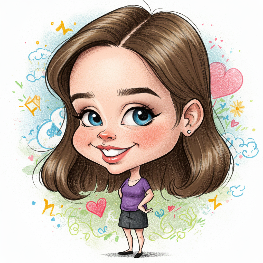 Caricature pencil drawing of an adorable woman in her mid-20s, using vibrant color pencils. Styled with humor and charm akin to a Pixar character, the drawing showcases exaggerated, amusing features on a pristine white background. Chaos and whimsy are infused throughout the image, creating a highly stylized and entertaining piece.