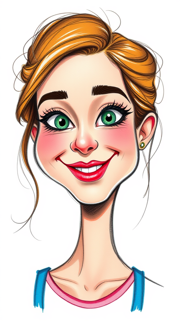 Caricature sketch, charming young woman in her mid-20s, vibrant colored pencils, Pixar-inspired style, humorously exaggerated facial features, set against a plain white background; infuse with playful chaos, aspect ratio 1:2, add extra flair and whimsy with a touch of stylization.