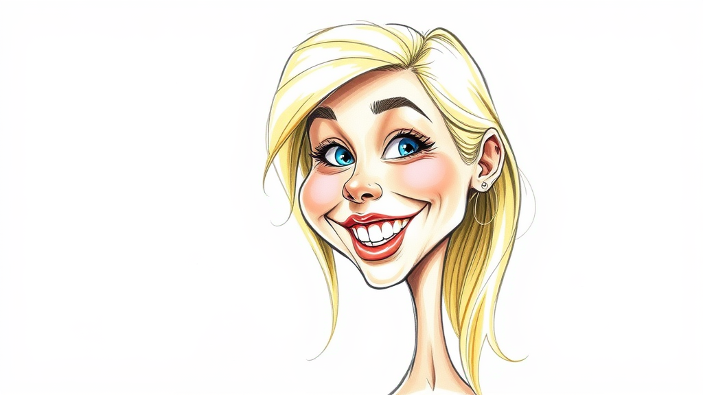 Caricature sketch of an adorable young woman with blonde hair, mid-20's, done with colored pencils, embracing the playful style of a street caricature artist. Her features are humorously exaggerated, bringing out a hilariously funny expression, set against a plain white background for contrast. The composition is creatively chaotic with an elongated aspect ratio, infused with a whimsical and highly stylized essence.