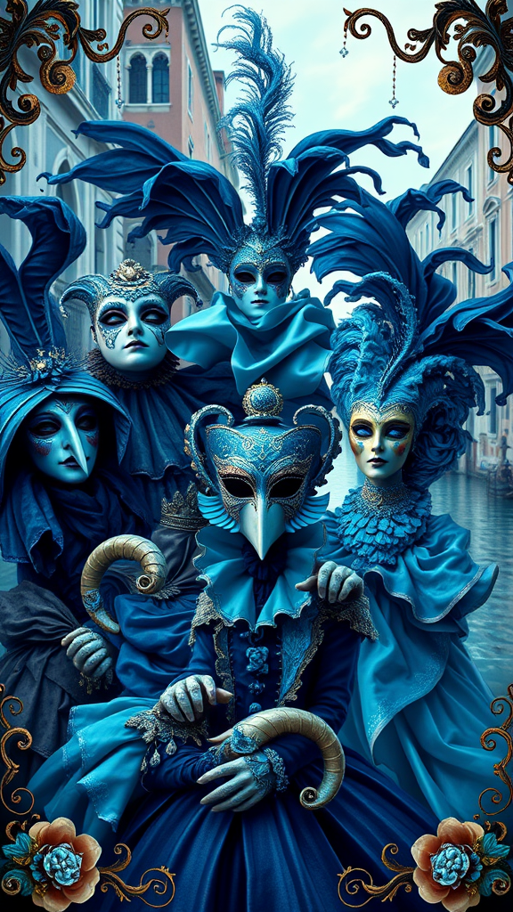 Carnival in Venice, a fantastical scene of vibrant colors and eye-catching compositions. Symmetrical arrangements in shades of navy and aquamarine dominate the scene, featuring characters with distinctive noses and subtle gothic references. A spiral group captures the essence of the celebration, blending expressive styles with Baroque influences. Intricate masks and flowing costumes add to the allure, set against the magical backdrop of the Venetian canals, creating an enchanting tapestry of imagination and festivity.