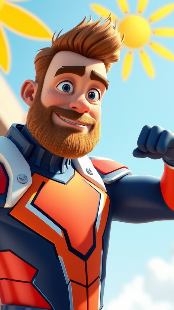 Cartoon 3D cinematic image of a 35-year-old superhero with a light brown beard and freckles, wearing a vibrant full costume. The scene is set in a sunny, bright environment with a Pixar-style aesthetic, featuring dynamic poses that highlight his strength and agility. The superhero's costume features sleek lines and futuristic design elements, with vivid colors that pop against the sunny backdrop. His expression exudes confidence and determination, capturing the essence of a hero ready for action. The overall atmosphere is energetic and uplifting, with stylized visual elements adding a touch of whimsy and adventure.