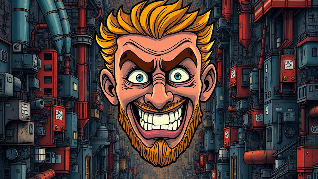 Cartoon featuring a vibrant, expressive face encircled by an intricate urban landscape, inspired by Tim Doyle’s style with industrial elements, filled with intricate and concealed details, richly dark in design, solarized highlights reminiscent of Agustín Fernández, evoking a sense of poster art, with an aspect ratio of 36:55 and a high level of stylization at 750.