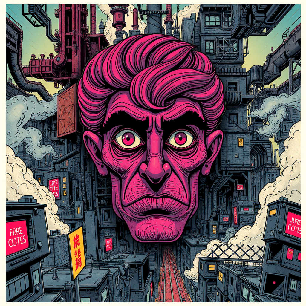 cartoon featuring a vibrant face encircled by a bustling cityscape, inspired by tim doyle's style, with intricate industrial forms, rich in hidden details and dark textures, reminiscent of solarizing masters and agustín fernández, in the essence of poster art, with a twist in perspective and distortions to create a surreal urban dreamscape, featuring dynamic contrasts in color and form, capturing the essence of a city alive with energy and mystery.