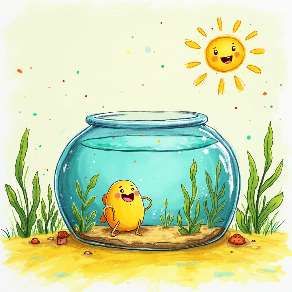 A cheerful, cartoon-style aquarium with rounded edges, housing a cute character enjoying a bright, sunny day. The scene is filled with vivid primary colors like yellow and green, resembling a crayon drawing. The setting is lively and whimsical, capturing the essence of youthful imagination and creativity.