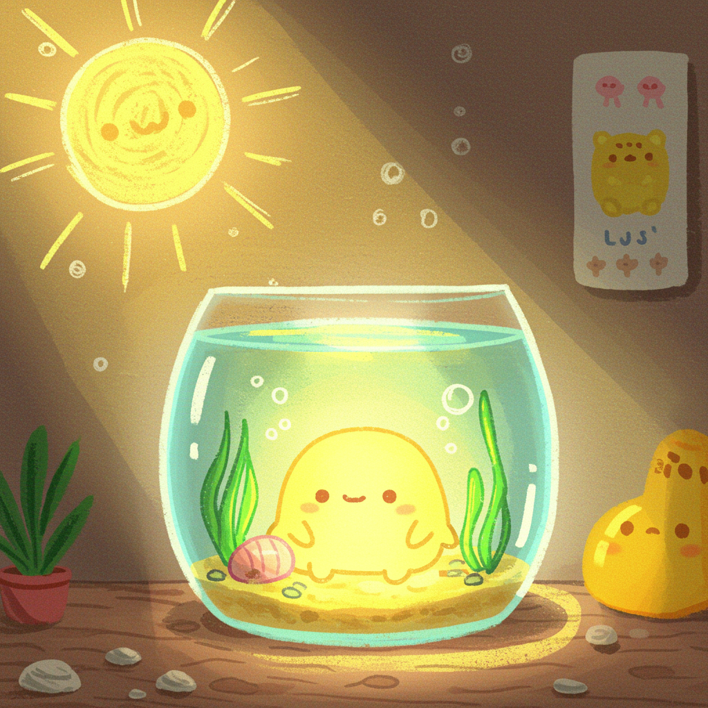 A cheerful, cartoon-style aquarium with rounded edges, featuring an adorable character inside, glowing under a bright sunny atmosphere. The scene bursts with primary colors like vivid yellow and lush green, giving it a playful, crayon-drawn appearance. It's an inviting and charming setting that captures the essence of a sunny day, filled with fun and whimsy, yet maintains a sense of uniqueness and originality in its design.