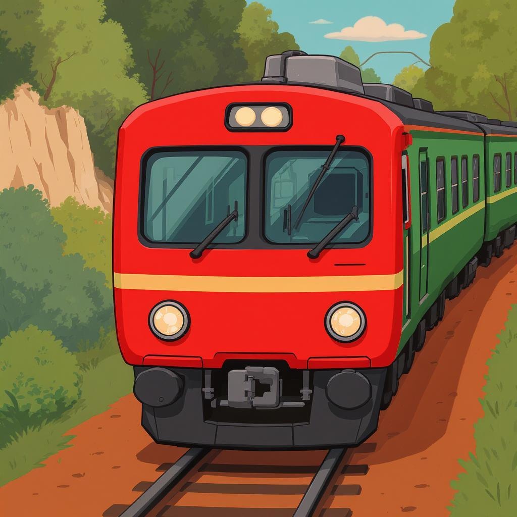 cartoon style image featuring a simplistic train design, focusing solely on the train with a red and green color palette, captured from a drone perspective, featuring elements of a cartoon portrait aesthetic, aspect ratio 5:4