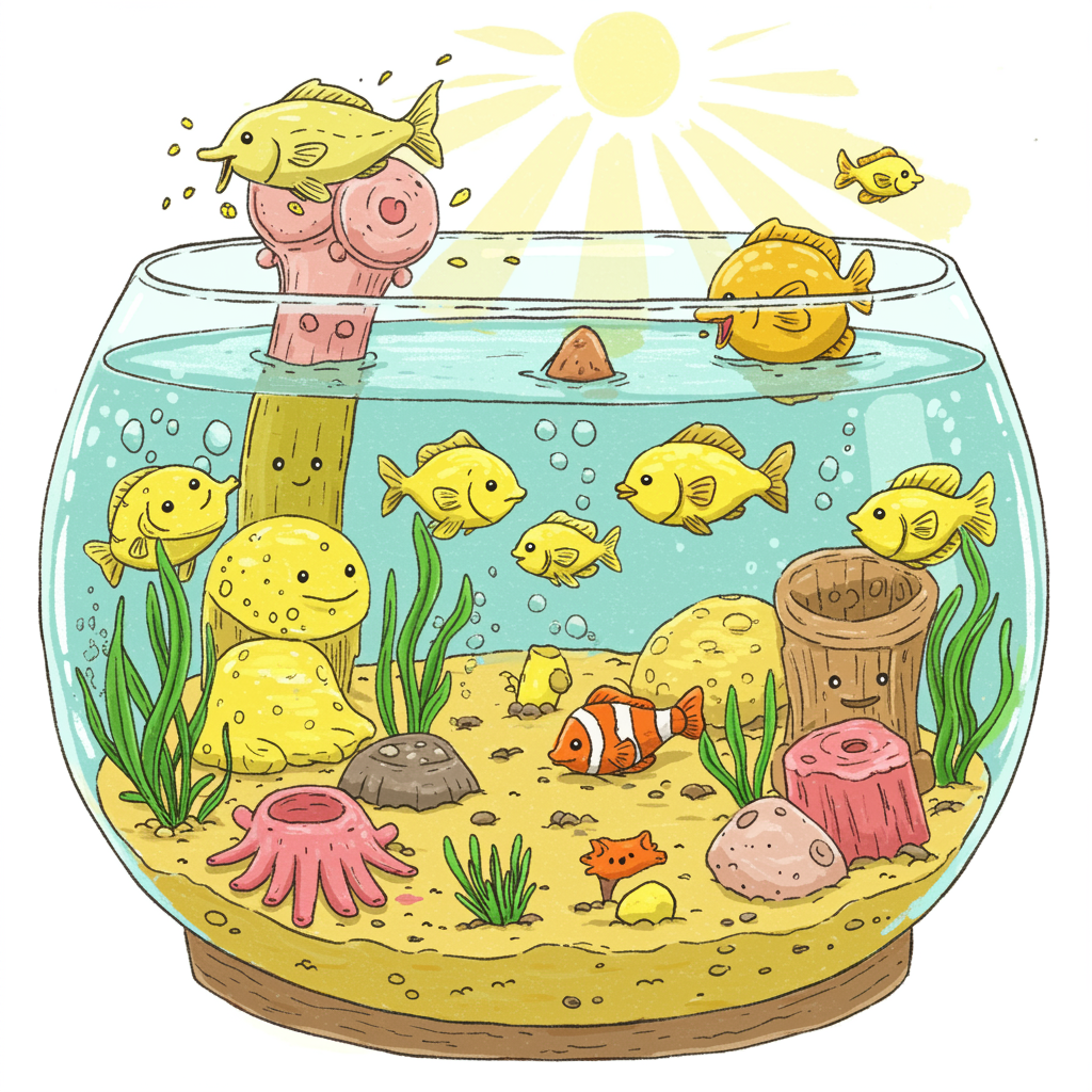 A vibrant, cartoon-style rounded aquarium filled with adorable creatures, set in a bright, sunlit scene. Dominated by cheerful primary colors, especially yellow and green, the scene resembles a crayon drawing. The artwork has a playful and energetic vibe, with elements that are diverse and charmingly imperfect, exuding unique personality and warmth.