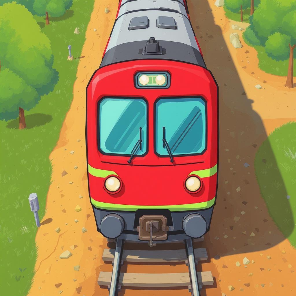 cartoon style transformation:5, simplistic cartoonized depiction of a train, focus on the train's photo only, vibrant red and green color scheme, aerial drone perspective, stylized cartoon portrait view, --aspect ratio 5:4.