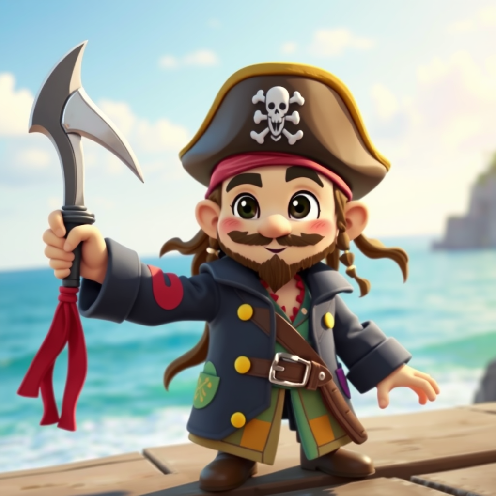 Cartoonish pirate character with whimsical features, inspired by a playful version of Captain Jack Sparrow, wearing a miniature pirate hat, an oversized coat with colorful patches, and brandishing a tiny cutlass, set in a lively seaside backdrop with clear blue skies and a gentle ocean breeze.