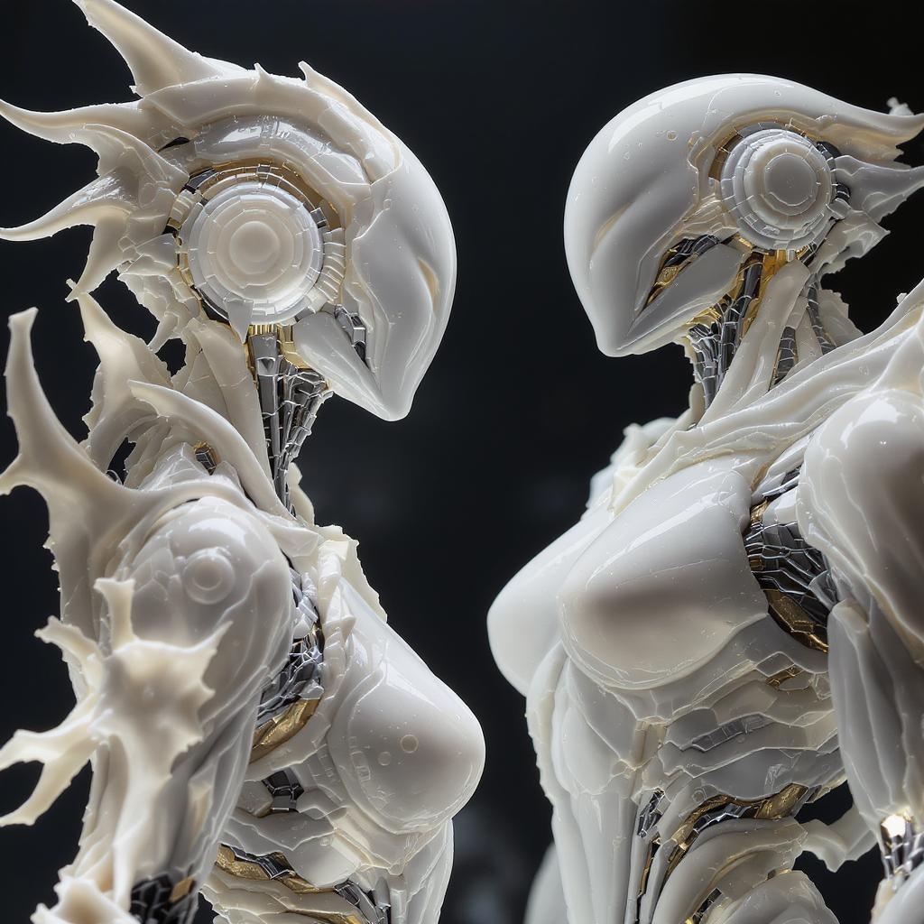 Carved porcelain cybernetic entities, full body poses, exquisitely detailed with a cinematic backdrop, inspired by Miki Asai's macro photography style, close-up shots, ultra-detailed and trending on ArtStation. Studio-quality sharp focus highlighting intricate features, with a touch of Greg Rutkowski's artistry, these creations blend organic and mechanical, capturing the awe-inspiring allure of futuristic sculptures.