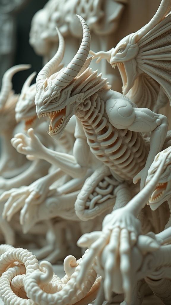 Carved porcelain cyborg demons in various dynamic poses, showcasing intricate designs with a high degree of detail, set against a cinematic background. Inspired by Miki Asai's macro photography, these close-up shots highlight the hyper-detailed craftsmanship, with sharp focus and studio lighting. The composition is reminiscent of trending art on platforms like ArtStation, featuring the intricate style of Greg Rutkowski, enriched with subtle creative twists in the texture and patterning.