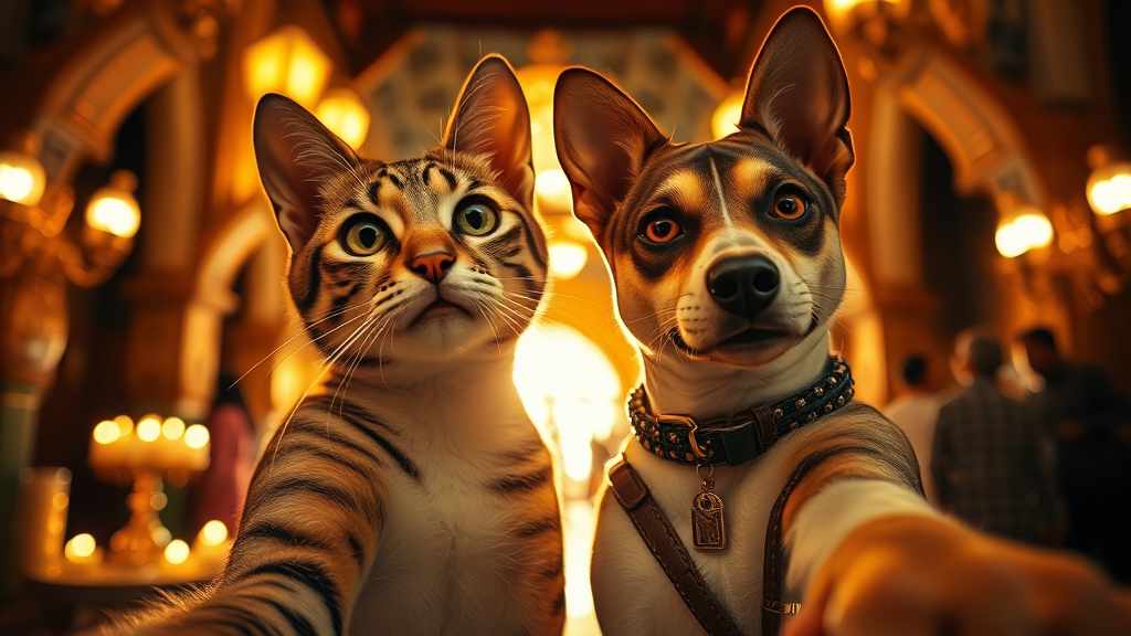Cat and dog posing for a selfie in the heart of Marrakech, Morocco, showcasing an elaborate, elegant scene with remarkable detail and sharp focus. The intricate symmetry and composed, cinematic quality highlight a dramatic ambient light, contributing to a professional, highly esteemed presentation. The vivid colors are inspiring, with a shiny, glowing effect that feels epic and brilliant. This scene is coherent and perfect, with an atmosphere that is both luxurious and futuristic. It captures a moment that is fantastic and illuminated, leaving a lasting, thought-provoking impression.