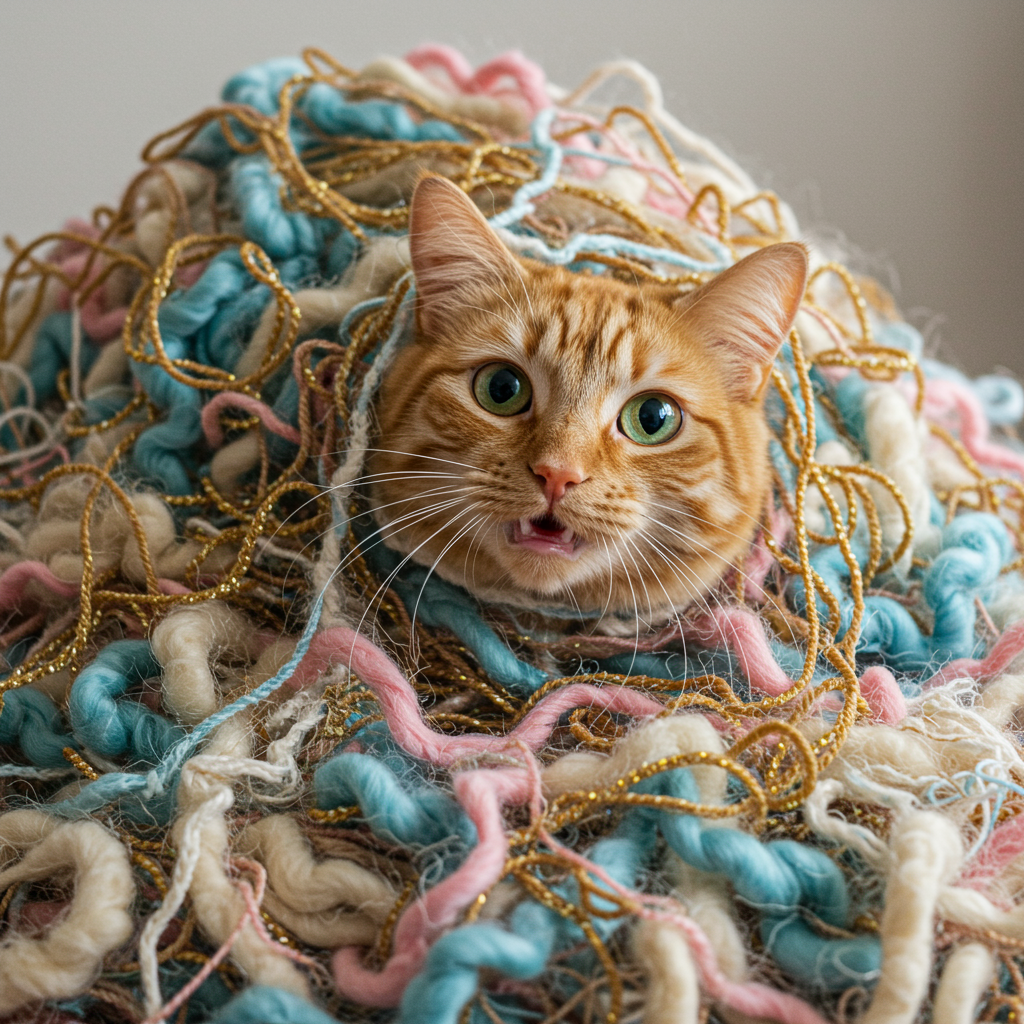 The mischievous cat found itself tangled in a mountain of yarn, eyes wide with playful mischief, as it plotted its next adventure in unraveling the colorful chaos.