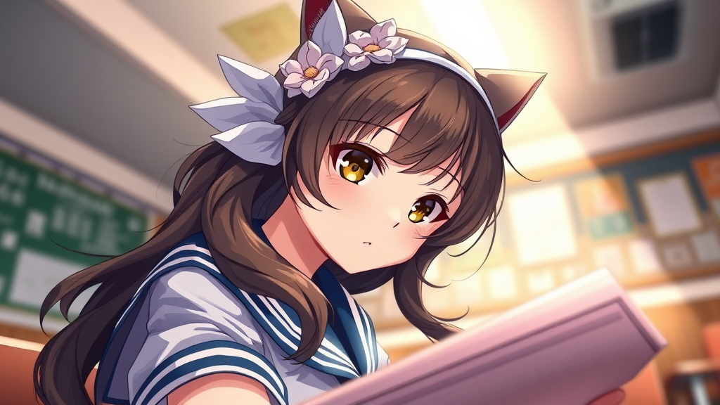Cat girl in a sailor uniform, shot from a low angle and centered in a classroom setting, her dynamic pose capturing attention as she studies with intense focus, sporting a flowery headband in her long wavy hair. The close-up captures her gaze as she looks towards the camera, with dynamic lighting enhancing her features. The depth of field effect artistically blurs the background, emphasizing her expression. This ultra-detailed 2D illustration, echoing the professional style of Makoto Shinkai, embodies an Instagram-worthy aesthetic and is trending on platforms like Pixiv, offering a fresh glimpse of creativity with unique lighting and composition choices.