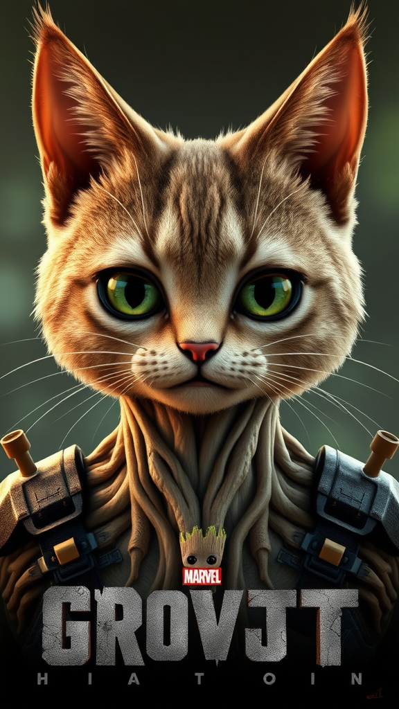 Cat head with anthropomorphic humanoid body, designed like a movie poster, featuring a Marvel-inspired small cute Groot character, showcasing high detail and hyper-realistic elements, rendered in octane style, emphasizing artistic creativity and unique flair, omitting traditional human features while maintaining a captivating visual appeal.