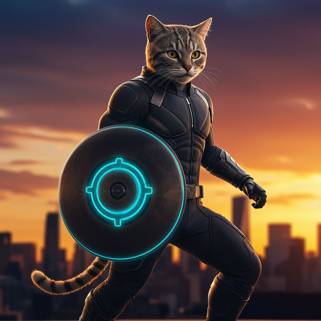 Cat-headed superhero with an anthropomorphic, muscular body, holding a futuristic shield, standing in a dynamic pose reminiscent of a classic action movie poster, hyper-realistic details, vibrant color palette, intricate textures, using octane rendering techniques, set against an epic urban skyline backdrop at sunset, no human faces, capturing the essence of a legendary defender with feline agility and strength.