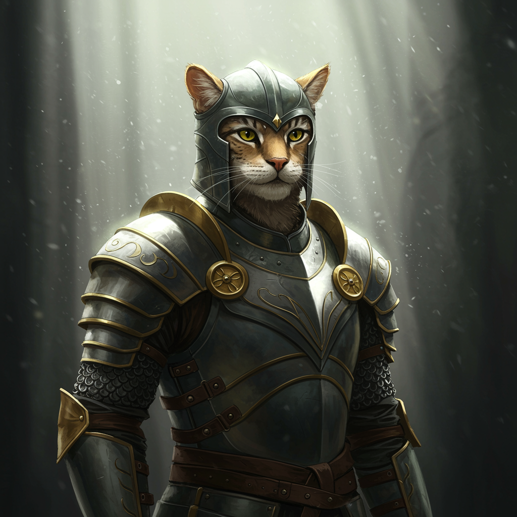 View this AI-generated image featuring an anthropomorphic cat warrior donning intricately detailed armor with a sleek and ornate helmet that hints at a mystical heritage posed confidently in a heroic stance bathed in ethereal backlight that casts dramatic shadows with light rays filtering through cr
