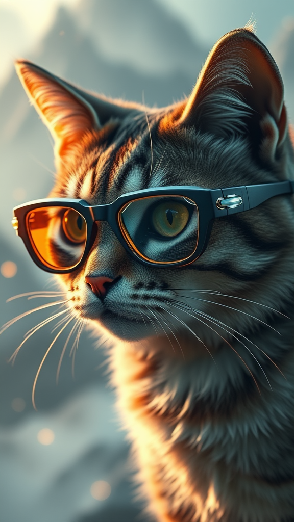 Cat wearing sleek, futuristic glasses in a cinematic light, set in an epic fantasy world, with intricate details and vivid colors, enhanced resolution, showcasing a misty landscape blending advanced technology and whimsical elements.