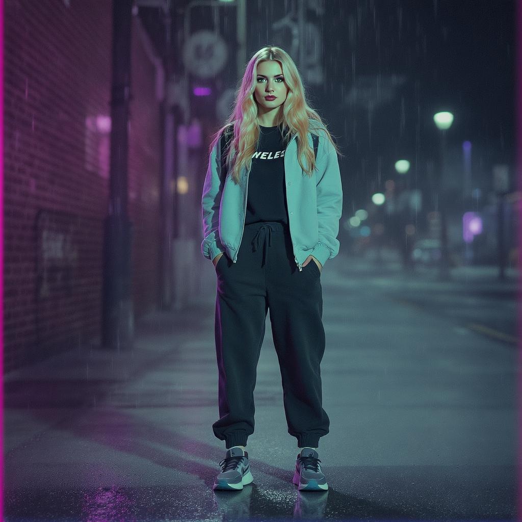 caucasian 25-year-old woman, full body, sporty sneakers, strawberry blonde long hair cascading over her shoulders, rounded cheeks, subtle widow's peak, vibrant green eyes, fashion model, urban street wear, contemporary outfit, iconic sneakers, cinematic film still, analog-inspired, raw realistic capture, ultra-detailed facial features, 8k ultra HD, professional DSLR imagery, gentle illumination, superior quality, film-like texture, shot on Fujifilm XT3, captured with a Plaubel Makina W67 Camera, 50mm lens at F/2.8, high dynamic range, hyper-realistic depiction, expertly color-corrected, atmospheric lighting, ethereal mist, soft depth of field, elegant reflections, extraordinarily high resolution, fashion editorial style, dreamlike vibe, nostalgic Nintendo Game Boy Color palette, finely crafted iso grain 낀 photo.