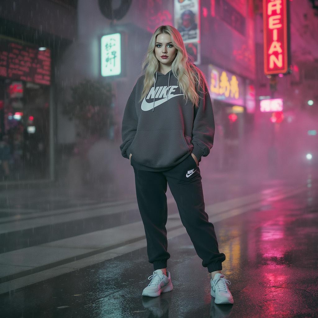 Caucasian 25-year-old woman, full body, wearing NIKE sneakers, strawberry blonde long hair cascading with chubby cheeks and a pronounced widow's peak, striking green eyes, embodying a model-like presence in trendy streetwear. Captured in a modern outfit infused with Nike aesthetics, the scene resembles a cinematic film still in analog style. The hyper-realistic, ultra-HD photo, shot in 8k resolution through a DSLR, emphasizes soft lighting and fine film grain. Photographed using a Fujifilm XT3 and Plaubel Makina W67 Camera, employing a 50mm lens at F/2.8. HDR techniques enhance the image, presenting a color-graded composition with volumetric lighting and ethereal fog. The atmosphere is moist with a shallow depth of field, introducing reflections and absurd resolutions, in a fashion-forward shot with a hint of psychedelia. The palette takes inspiration from a Nintendo Game Boy Color, incorporating ISO noise to evoke a dreamlike quality.