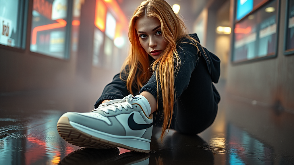 Caucasian 25-year-old woman in full-body view, wearing Nike shoes, with long strawberry blonde hair, a widow's peak, chubby cheeks, and bright green eyes. She's posed as a model, dressed in streetwear with a modern outfit featuring Nike branding. Captured as a cinematic film still in an analog style, the image showcases a hyper-realistic, ultrarealistic photo with an 8k UHD resolution. The scene is photographed using soft lighting, incorporating film grain for a high-quality finish. Utilizing a Fujifilm XT3 with a Plaubel Makina W67 camera, a 50mm lens at F/2.8, the shot embraces HDR with vibrant color grading, enveloped in volumetric lighting and gentle fog. The environment is moist, with a shallow depth of field highlighting reflections. It offers an absurdly high-resolution fashion shot, infused with a psychedelic flair inspired by a Nintendo Game Boy Color palette, with a touch of iso noise reminiscent of a dreamlike state.
