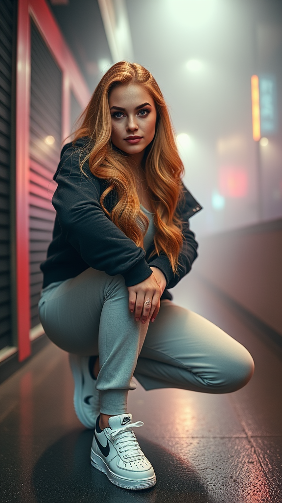 Caucasian 25-year-old woman, striking a pose in a modern, stylish street wear outfit paired with iconic Nike shoes. Her strawberry blonde hair cascades in long flowing waves, framed by chubby cheeks and a distinctive widow's peak. Her captivating green eyes shine with a hint of whimsy. The image captures a cinematic film still aesthetic, rendered in an analog style with a hyper-real photo quality. Shot in 8K UHD on a DSLR, the scene is enveloped in soft yet high-quality lighting, with a touch of film grain reminiscent of a Fujifilm XT3. The moment is captured through a Plaubel Makina W67 Camera using a 50mm lens at F/2.8, highlighting a rich, HDR-enhanced color grade. Volumetric lighting and fog create a moody, atmospheric scene, with a cool moist sheen subtly visible. A shallow depth of field adds a dreamy, psychedelic touch, enhanced with reflections and an absurd resolution. The overall tone is influenced by a Nintendo Game Boy Color palette, accentuated by a characteristic iso noise that gives it a Bad Dream surrealism, offering a distinct sense of nostalgia and depth in this striking fashion shot.