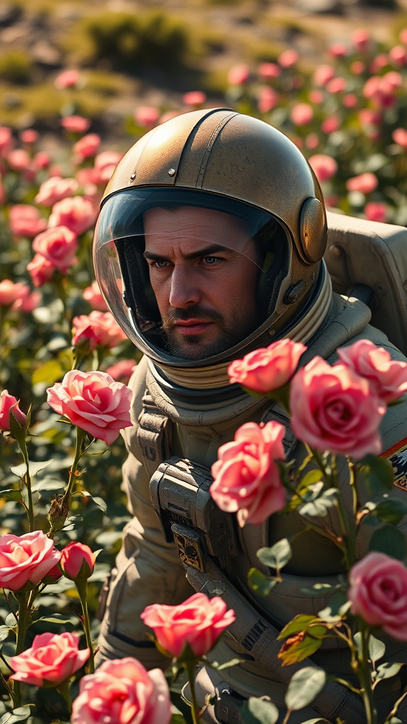 Caucasian astronaut wearing a helmet with dark gold, militaristic realism-style paint job, walking amidst a lush field of brightly blooming roses, with sunlight casting long shadows, full-body rendering in high definition, rugged terrain, intricate rose details, and a focus on the astronaut's distinctive nose and weathered, battle-hardened expression, artistic ratio set to 69:128, version 6.0, texture resolution at 750.