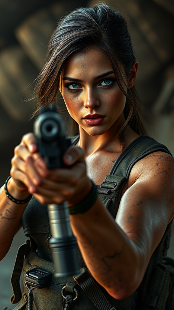 Caucasian female marine with rugged, dirty skin, holding a firearm, aiming directly at the viewer. Featuring a touch of allure, her stance is confident, flirtatious, and composed within a full-length frame. Showcasing highly detailed, realistic skin texture, with photo-realistic quality in 8k resolution. The setting uses diffused soft lighting and sharp focus, producing a hyper-realistic and cinematic ambiance. The background is intricately detailed, employing CGI elements in a controlled environment. This portrayal ensures realistic anatomy and proportions, devoid of errors such as blurred imagery, extra limbs, or poor quality details. There's an emphasis on authenticity, avoiding low resolution, artifacts, and any visual discrepancies akin to amateur executions, such as watermarks or superfluous features.