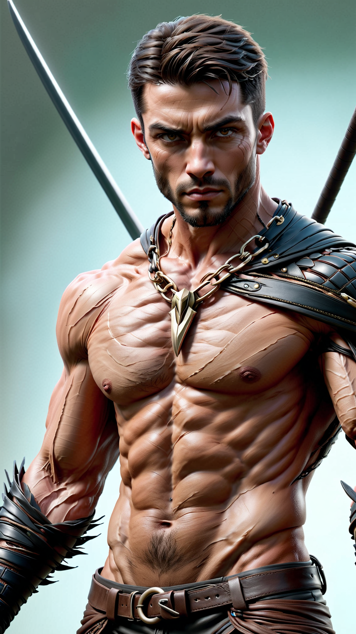 Caucasian jungle man, guardian of the rainforest. Jypermasculine male. Dark brown hair short on sides longer on top {{{short hair}}}. A brown leather band tied around the forehead. Tanned skin, smooth and hairless. Pale grey eyes with intense spiritual gaze. Strong brow and chiseled strong jaw, handsome, masculine rugged looks. Soul patch on face. Tall, strong, muscular, sinewy, well defined, broad shoulders, broad chest, wide back. Olympian gymnast build/body. Gold necklace/talisman with leather strap around the neck. Wrapped brown leather bands around wrists, bands around tops of biceps, accenting big arms. Brown o-ring harness on the chest, strapped from the shoulder. Brown leather loincloth, barely covering the crotch area, exposing strong powerful legs. Soft, brown cloth knee-high boots wrapped around legs. Full body pose. He wields a unique bastard sword that he straps to his back. He keeps company with a huge, sleek black panther. ((MASTERPIECE))