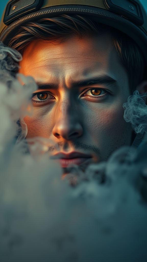 Caucasian male headshot of a soldier enveloped in misty smoke, set in a cinematic movie style. Captured using an analog approach, this hyper-realistic image showcases an ultrarealistic face in 8K UHD resolution through a DSLR lens. Featuring soft, high-quality lighting, subtle film grain from a Fujifilm XT3, and photographed with a Plaubel Makina W67 Camera with a 50mm lens at F/2.8, the picture embodies HDR brilliance with expert color grading. It bathes in volumetric lighting and fog, giving a moist, reflective atmosphere with a shallow depth of field. Rendered in an extravagant resolution, this fashion-inspired shot carries a psychedelic twist using a Nintendo Game Boy Color palette, accented by ISO noise for a dreamlike effect.