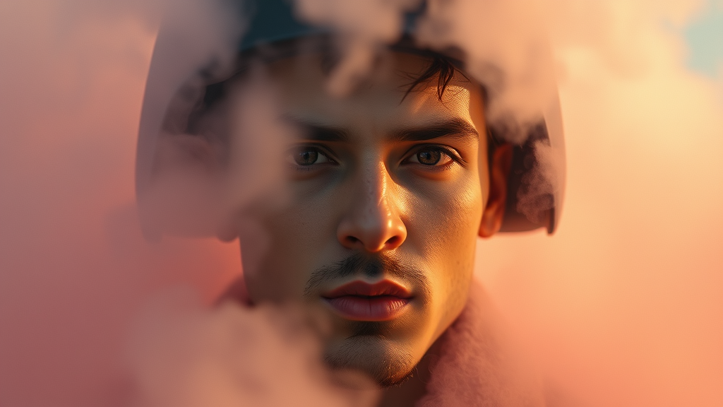Caucasian male headshot, soldier in a cloud of smoke, cinematic film aesthetic, analog vibes, RAW quality, ultra-realistic face, 8k ultra-high-definition, DSLR clarity, soft ambient lighting, high-grade film grain, shot on a Fujifilm XT3, captured with a Plaubel Makina W67, 50mm lens, f/2.8 aperture, HDR clarity, hyper-realistic finish, rich color grading, enveloping volumetric lighting and fog, moisture sheen, shallow focus, reflective surfaces, high resolution, fashion influence, psychedelic twist, evoking a Nintendo Game Boy Color palette, heightened ISO noise, BadDream atmosphere.