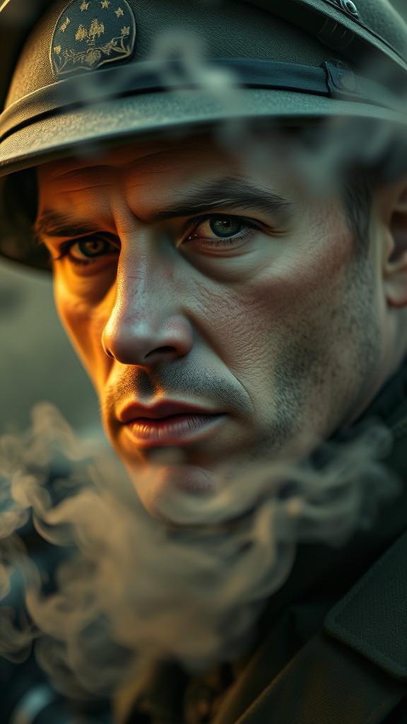Caucasian male headshot, soldier with intense expression, smoke swirling, cinematic film still with analog vibe, RAW photo capturing hyper-realistic face details, 8k UHD, taken with DSLR precision, soft nuanced lighting and film grain texture. Plaubel Makina W67 camera brilliance, 50mm lens at f/2.8, HDR effect enhancing depth, colorgraded for drama, enveloped in volumetric fog creating a moist atmosphere, shallow depth of field emphasizing subject, subtle reflections adding dimension. Fashion shot with a surreal edge, infused with a psychedelic twist and distinct Nintendo Game Boy Color palette, artistic ISO noise for texture, capturing a dreamlike scene with an undertone of nostalgia.