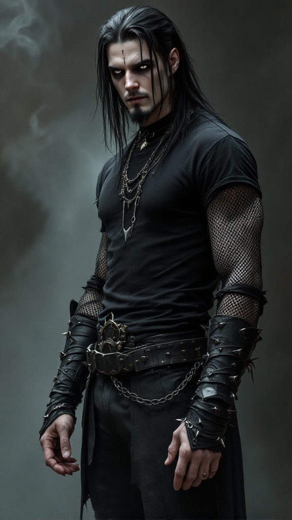 Caucasian male, masculine. Speed Metal/Death Metal fan. Tall, lanky, slender but muscular, sinewy, well defined. Pale skin, dark eyes, dark Goatee on face. Straight, black, long hair, parted down the middle. 3 spiked piercings running down his forehead. Dark Goth make-up around his eyes. He wears a black, long sleeved mesh T-shirt. Black Leather bracers on his arms with barbed wire. Black leather pants. Black leather belt with spikes, heavy black engineer boots. He has infernal ties, so he exudes faint black smoke wherever he goes, and might be smoldering a little. Full body pose.