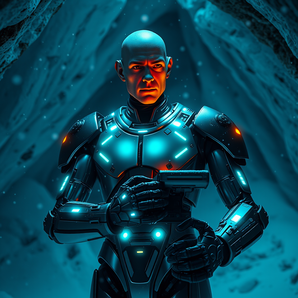 CCT Attitude as a Trekborg in a dimly lit, snow-covered mountain cave, snowflakes gently falling onto the Borg's sleek, high-polish, metallic exoskeleton, warm blue-green LED displays pulsing with a hypnotic rhythm on its chest plate and arms, casting an eerie glow onto the surrounding ice and rock formations, capturing a fleeting moment of introspection in the midst of calculation, the Trekborg's cloned face revealed, with a subtle cross-eye expression, its long neck extended, keeping a watchful gaze, while its hands, mutated into multi-fingered appendages, contain a complex device crafted from scavenged technology, as it analyzes the environment and processes its findings, rendered in cinematic 16k, 4k, and 8k resolutions, with a focus on extreme detail and moody lighting, incorporating AI-driven text overlays, stencil rock carvings, and optimized glare and lens flares, in a blend of peak UHD and HDR quality, pushing the limits of contrasted visual resolution.