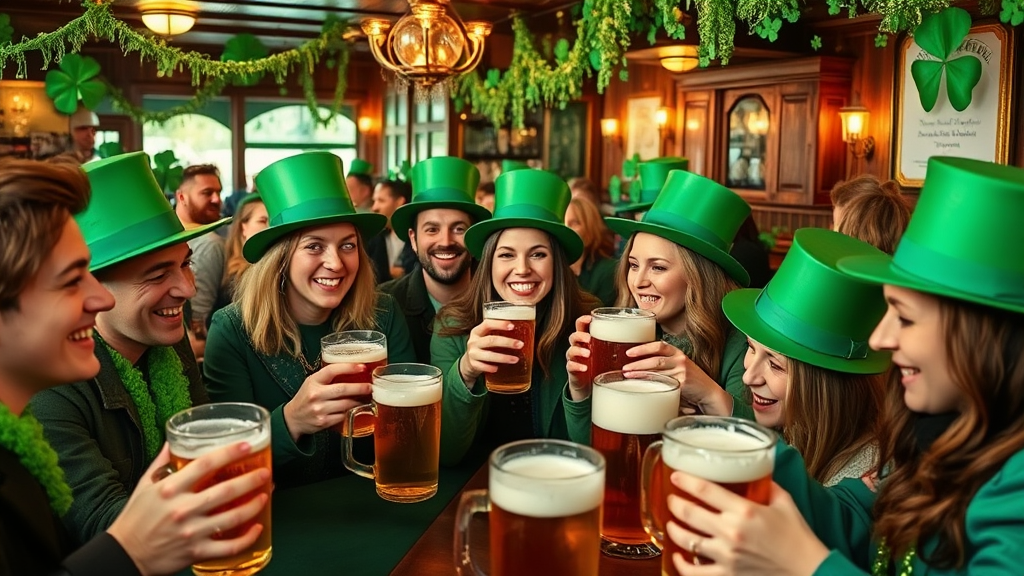 Celebrate St. Patrick's Day with a lively scene featuring cheerful crowds enjoying pints of beer in a vibrant pub adorned with green decorations and shamrocks. People sport traditional Irish hats while music plays in the background, creating a festive atmosphere filled with laughter and camaraderie. The colors green and gold dominate the setting, embodying the spirit of Ireland and the joy of this beloved holiday.