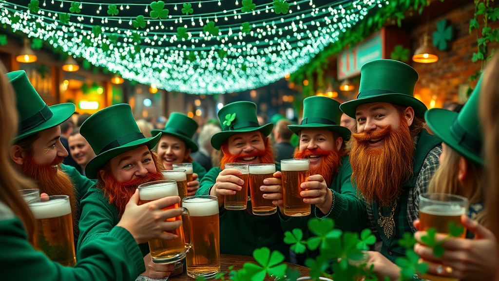 Celebrate St. Patrick’s Day with a lively scene featuring Irish charm, filled with pints of beer, cheerful leprechauns wearing green top hats, and vibrant shamrocks. The atmosphere is festive and joyous, with people toasting under a canopy of twinkling lights, embodying the spirit of Irish culture and camaraderie.