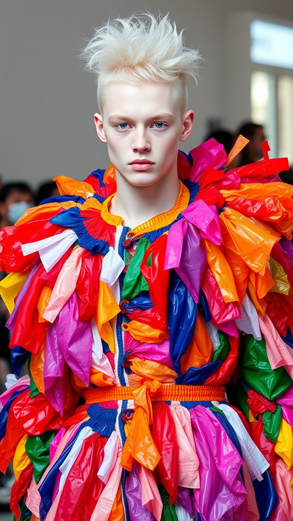 Celebrating the fusion of audacity and inclusivity in fashion, this striking albino male model captivates in an extraordinary garment crafted from vibrant, recycled plastic bags. A testament to personal expression and limitless style, the ensemble underscores the rich diversity and inherent beauty found within fashion's ever-evolving landscape.