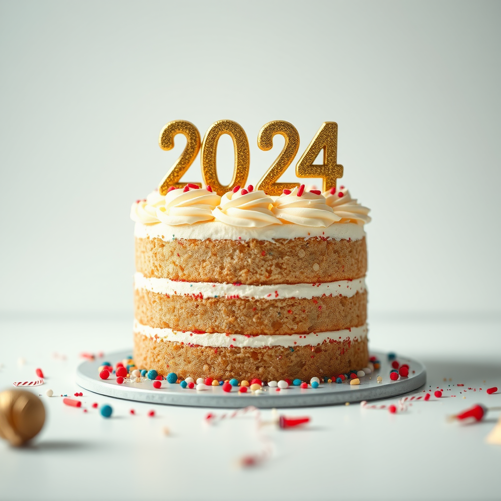 Celebratory New Year's 2024 cake, vibrant and joyful, captured in an intimate close-up portrait. Photorealistic render using a 50mm lens for a natural perspective, with soft, natural lighting illuminating the cake's intricate details on a pristine white background. Shot with a Canon SL3 DSLR for unmatched image quality. The scene is rendered as a stunning digital painting, with cinematic allure, ensuring each detail is crisp and lifelike in 8K and 4K HD resolution. Dynamic lighting highlights the cake's textures, with an emphasis on perfect composition and breathtaking high-resolution clarity in 32K HD. Subtle creative enhancements add a festive flair while maintaining the core celebratory essence.