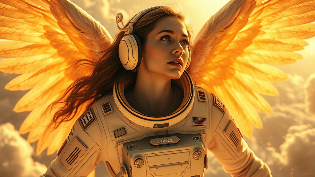 Celestial angelic woman in a heavenly realm, depicted with intricate satellite imagery elements and a futuristic spacesuit adorned with delicate details, floating gracefully above. Captured with an epic sense of photography, emphasizing natural light and photorealism with dramatic cinematic lighting. Ultra-HD 8K resolution, showcasing the highest quality and detail. Imbued with a warm, golden glow, creating an atmosphere that is both majestic and ethereal, maintaining a 9:16 aspect ratio for a striking composition.