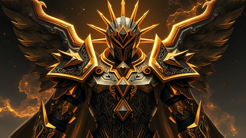 Celestial armor adorned with radiant gold and shadowy black diamonds, embodying the eternal clash between light and darkness, good and evil.