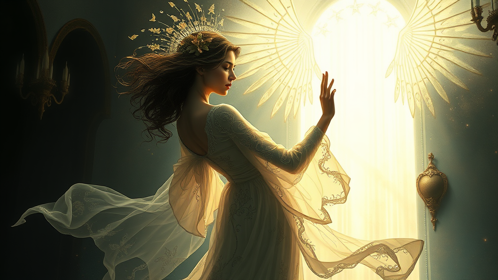 Celestial elegance in a single piece, a ghostly figure emerges from the darkness into a bright, heavenly light, her attire intricately detailed with Art Nouveau patterns echoing Alphonse Mucha's style. The scene, infused with ethereal beauty, reflects the dynamic interplay of shadows and light. Captivating and surreal, the artwork embraces the elegance and grace of Artgerm's and Greg Rutkowski's signature touches, capturing a moment both timeless and trending on Artstation.